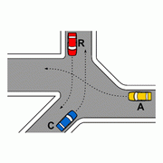 | Secondo le norme di precedenza nell'incrocio rappresentato in figura il veicolo C deve passare dopo i veicoli R e A | Mostra risposta |