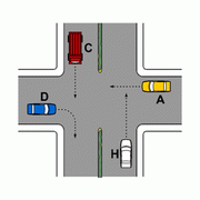 | Nell'incrocio rappresentato in figura i veicoli passano nel seguente ordine: H, A, C, D | Mostra risposta |