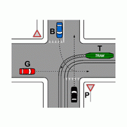 | Nell'incrocio rappresentato nella figura il conducente del veicolo P transita contemporaneamente al veicolo B, ma dopo il tram | Mostra risposta |