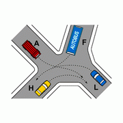 | Secondo le norme di precedenza nell'incrocio in figura i veicoli debbono transitare nell'ordine: H,A, F, L | Mostra risposta |