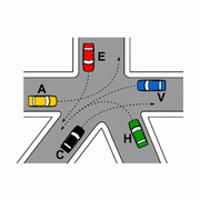 | Nell'incrocio rappresentato in figura i veicoli disimpegnano l'incrocio nel seguente ordine: A, E, V, H, C | Mostra risposta |